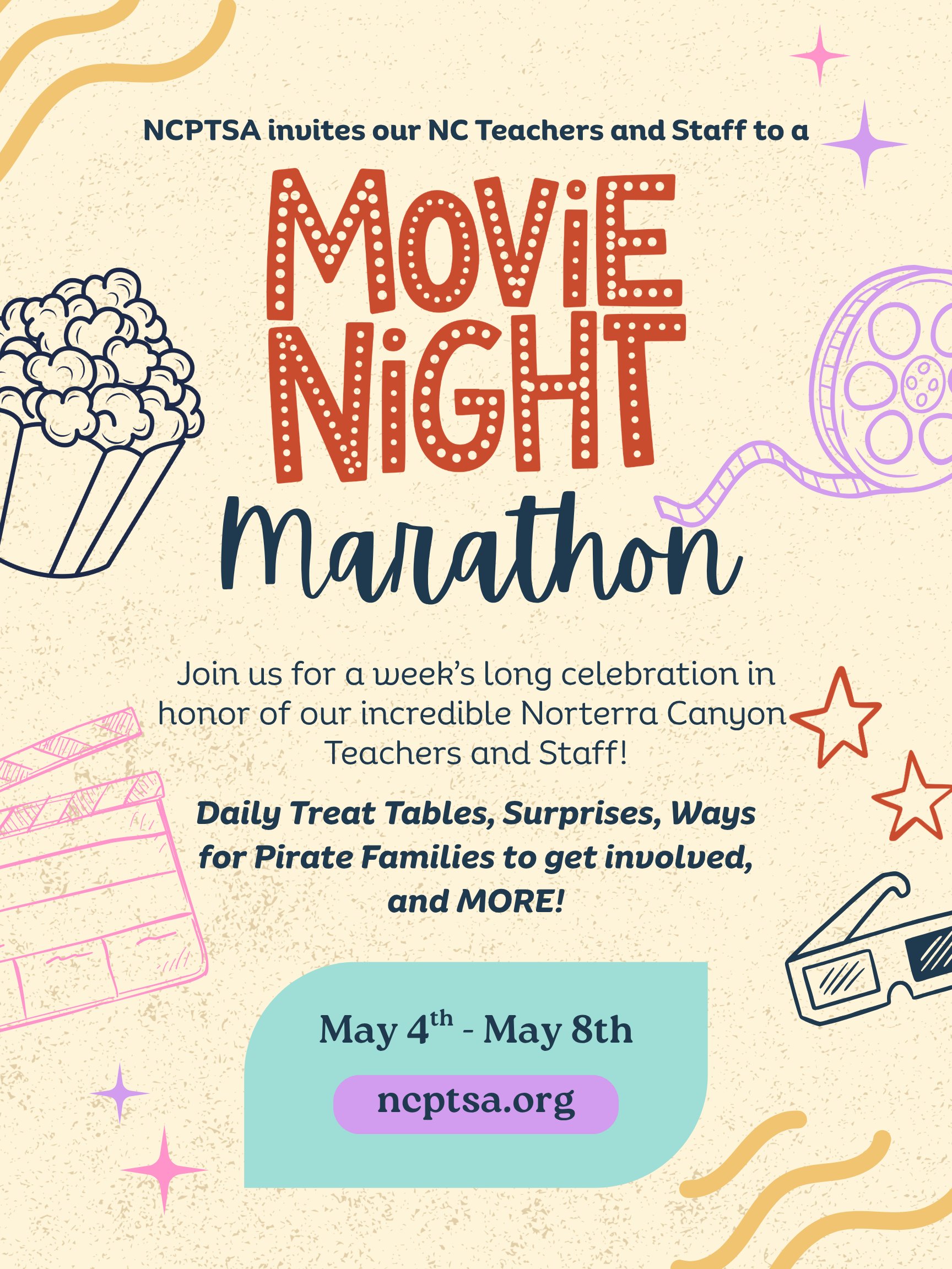 Get ready for a week-long cinematic celebration! NCPTSA is rolling out the red carpet for our incredible Norterra Canyon Teachers and Staff. Each day features a blockbuster theme with a "Feature Presentation,” so our Staff can cozy up, relax, and enjoy a Movie Marathon!