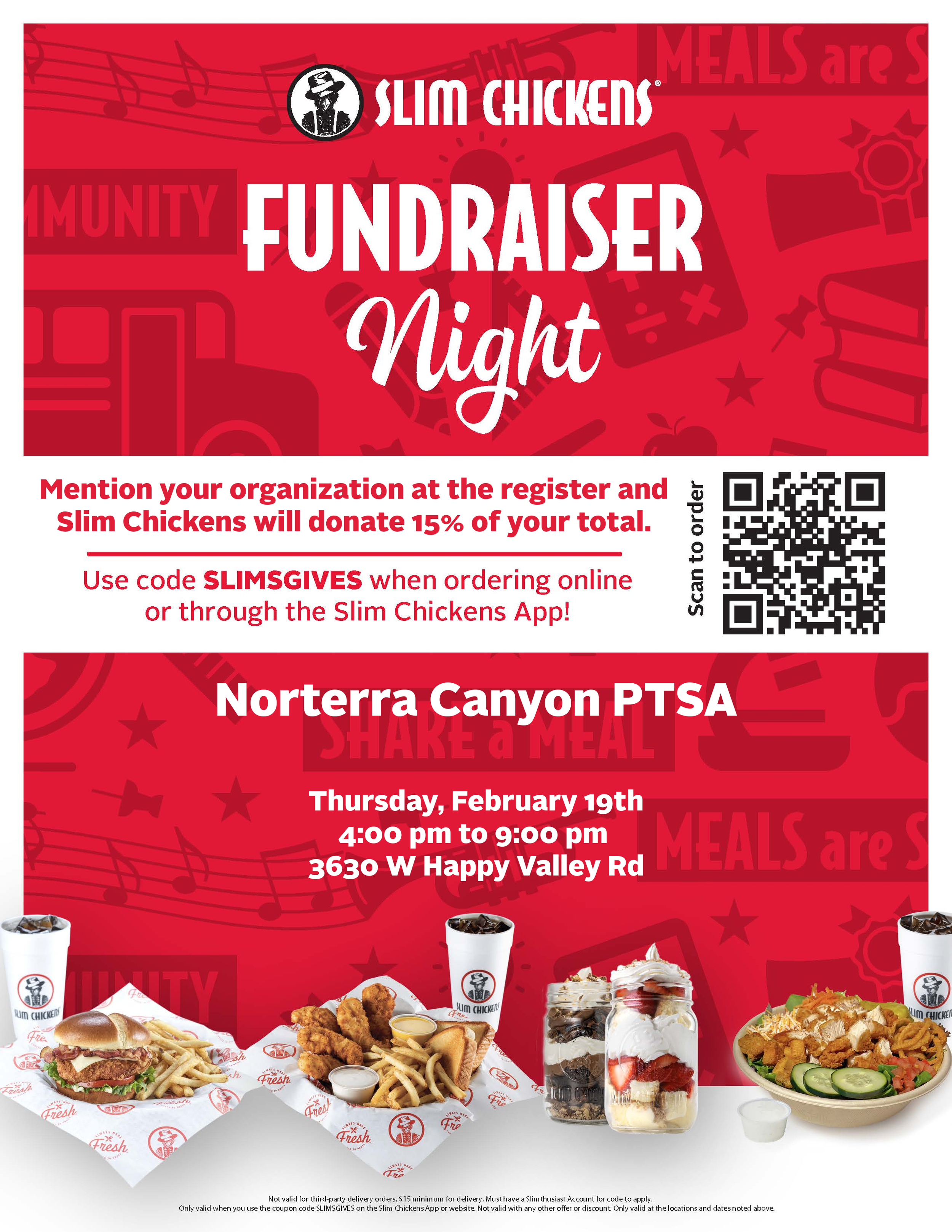 Come aboard with the NCPTSA and Pirate Families at Slim Chickens - Happy Valley for a special Dine-In night as we celebrate our Norterra Canyon Pirate students! Mention Norterra Canyon when ordering and 15% of all NC food sales from 4pm-9pm will be donated back to NCPTSA! You must mention this flyer when ordering at Slim Chickens - Happy Valley. Online orders are good for this promotion and use code: SLIMSGIVES